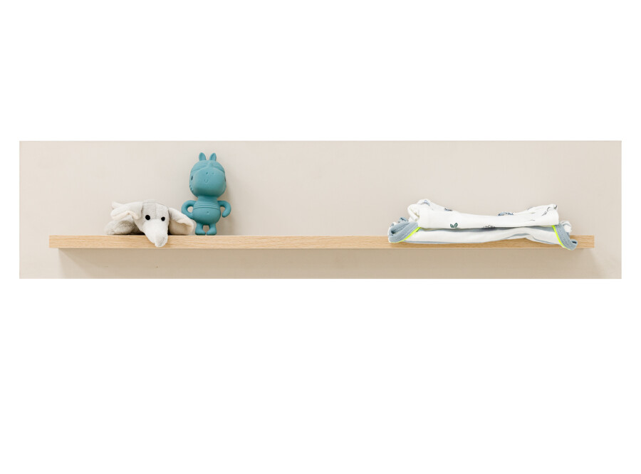 Wandrek Amira is voorzien van een ruime legplank. Het wandrek is uitgevoerd de kleur dune in combinatie met gelakt beuken. De kleur dune, ook vaak oatmeal genoemd, is een neutrale, natuurlijke kleur die zich goed laat combineren. Het hout van dit wandrek is afkomstig uit Europese bossen. Plaats dit wandrek boven de commode om spulletjes eenvoudig bij de hand te hebben.